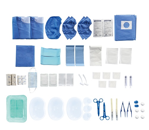 包布、一次性使用无菌手术单、一次性使用无菌手术洞巾,选配组件为一次性使用无菌手术帽、医用外科 口罩、橡胶外科手套、一次性使用手术衣、纱布片、敷贴、消毒刷、无菌棉球、止血带、医用胶带、纱 布绷带、弹性绷带、无菌塑柄手术刀、敷料镊、器械钳、无菌医用垫单、医用隔离鞋套、器械保护罩、 擦手巾、药杯、弯盘、托盘。